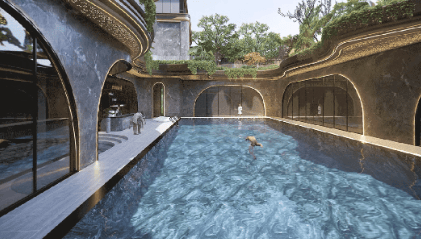 高端会所与园林景观:项目自带超1600平方米五星级酒店式双会所,配备泳池、更衣室、淋浴间等设施;园林设计结合约4.2米水帘瀑布造景,营造四季分明的美丽景观。