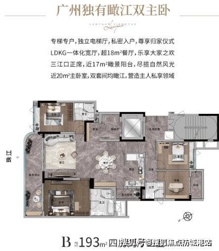【兰园江悦】主打两种大平层户型:193平方米和285平方米。所有户型均为专梯入户,确保了私密性和尊贵感。其中,285平方米户型特别适合追求极致空间享受的家庭,而193平方米户型则更适合注重性价比的小型家庭。每户均享有L型一线珠江曲线阳台,最大化利用江景资源。