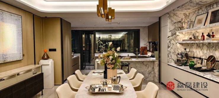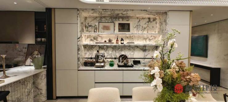 踏入样板房的瞬间,客厅与餐厨的通透质感便直击人心。大面积雪花白大理石从地面延伸至墙面,天然纹理在光影流转中宛如流动的画作,尽显自然艺术之美。森磊建设对选材近乎严苛,每块大理石都历经多轮筛选,确保纹理连贯、质地上乘;再以专业切割与无缝铺贴工艺,让空间浑然一体,格调自显。