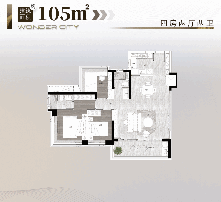 目前建面约105㎡的四房户型,做到了四开间朝南,LDKB一体化客厅,以及可以在三房与四房之间灵活定制。