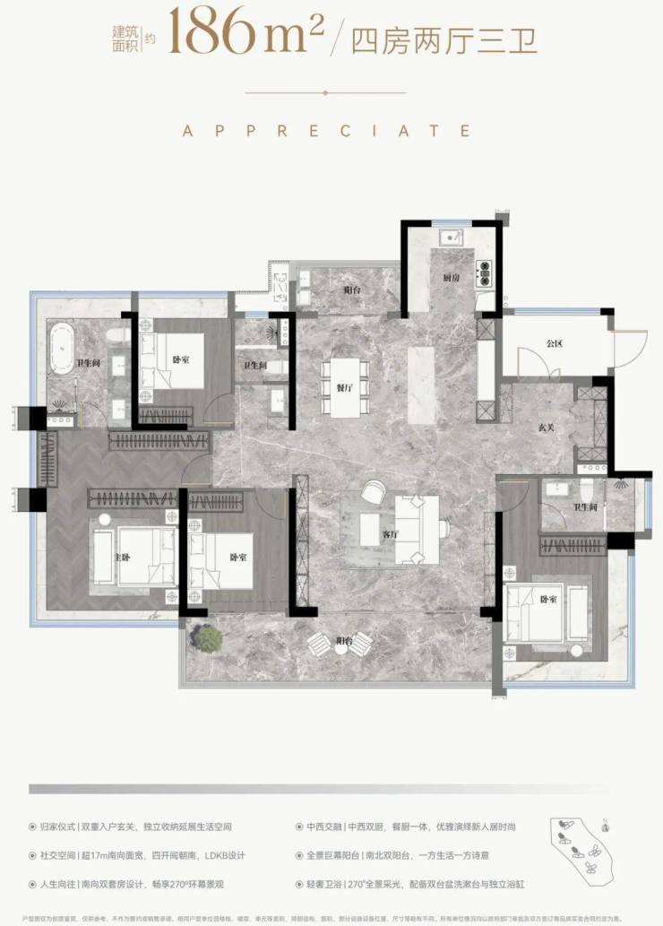 ✅真跃级:约3.75m开间主套,步入式衣帽间+270°景观飘窗+三分离卫浴;