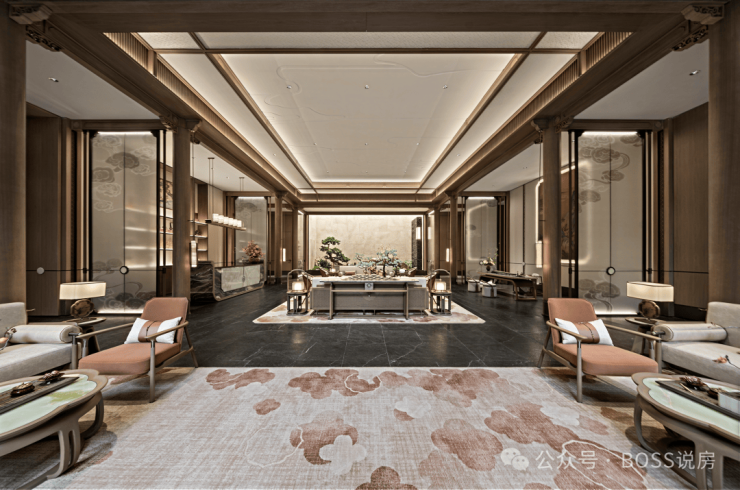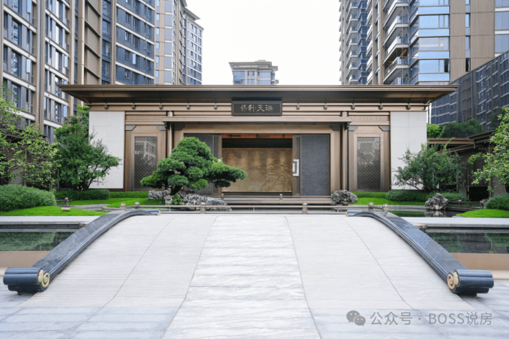社区打造约6.8万㎡新中式园林,以“礼道-见松-步水-游廊-归堂”为设计理念,五重门庭、九礼法园,东方府院美学尽显。