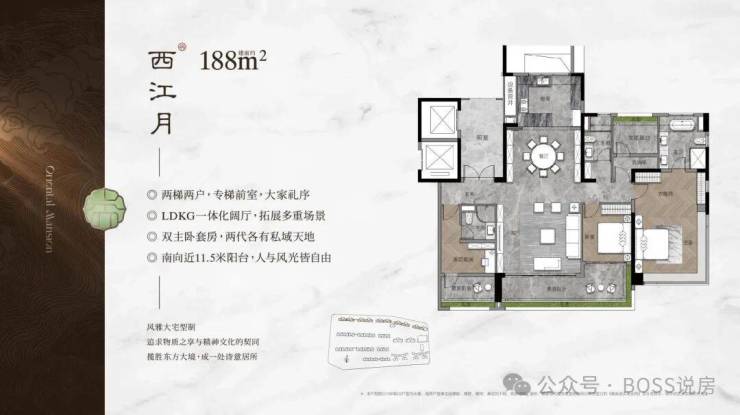 项目产品涵盖107-268㎡三至四房,从刚需到高端改善全覆盖,2梯4户、2T2、2T3多种梯户比,户型方正南北通透,部分户型带6.4-11.5米超大阳台、主卧L型飘窗,空间利用率和居住体验双高。