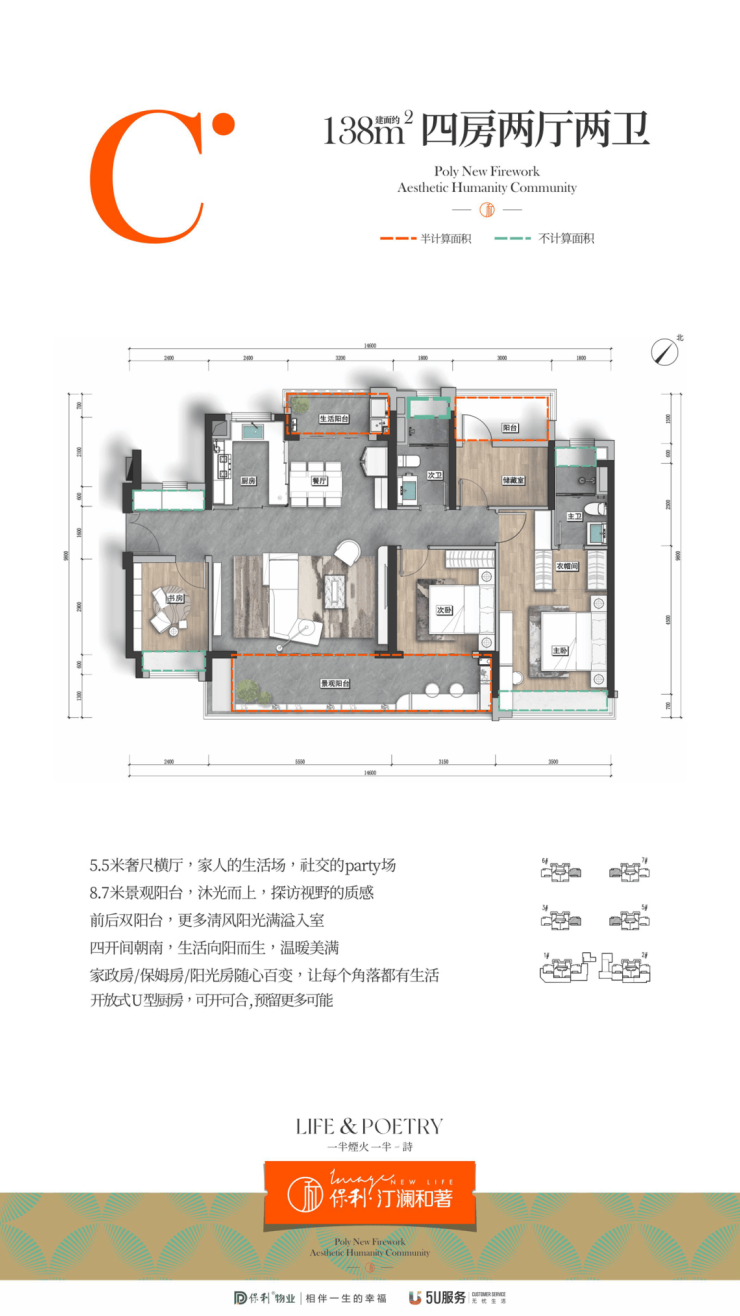 项目提供建面约109㎡三房两厅两卫、120㎡和138㎡四房两厅两卫,三个面积段可以对位不同购房群体。