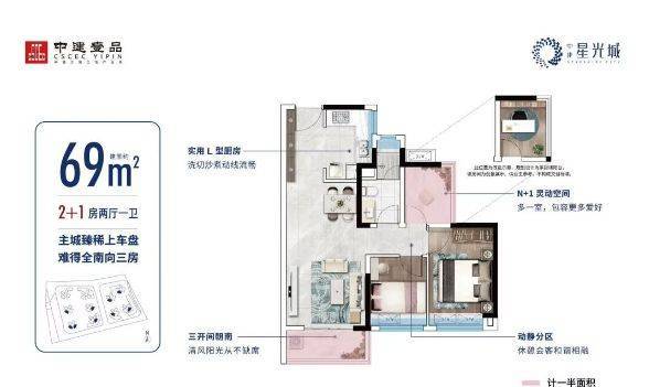 中建星光城主打“高实用率+全南向”产品哲学,全系户型实用率高达94%-96%,远超市场平均水平。主力在售面积段为69-100㎡,精准切中刚需及刚改痛点: