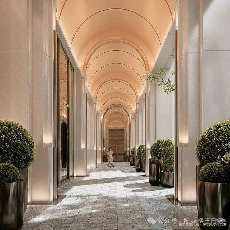 还有立体式垂直园林、带瀑布造型的悬浮泳池,就连9米抬高穹顶长廊,都是借鉴了卢浮宫阿波罗永恒长廊的灵感,仪式感拉满。