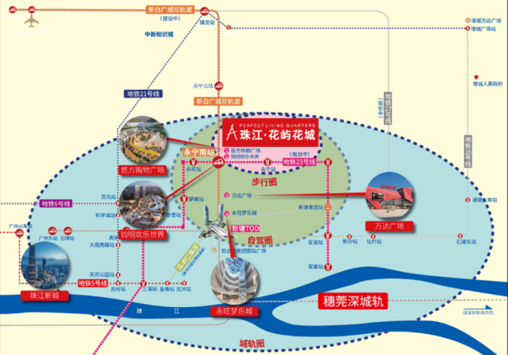 【交通方面】珠江·花屿花城位于广州科学城、增城国家级高新区、广州东部CBD之间,拥有多维立体交通网络。