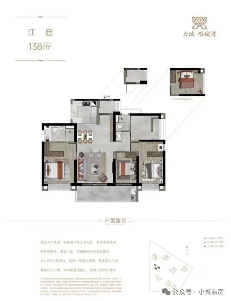 建面约138㎡,望江大平层户型,四开间朝南,采光、通风好,拥有独立入户花园和约6.8米的江景阳台,进一步拉升改善住户的居住体验。
