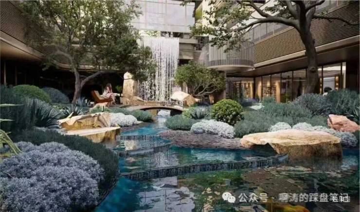 飞瀑下沉庭院:“小中见大、藏景藏意”,飞瀑、叠石、流水、绿植错落排布,流动的水景与静谧的山石相映,既为赏景绝佳之地,更是调节家庭气场、滋养身心的秘境。