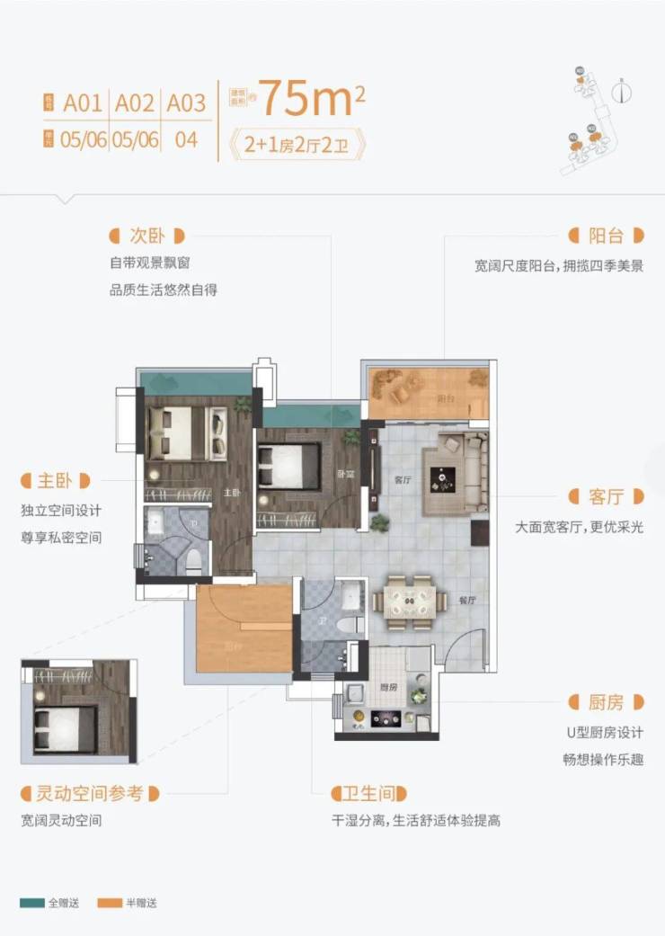 【爆款户型】建面约75㎡2+1房两厅二卫