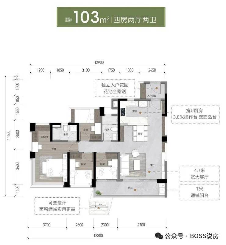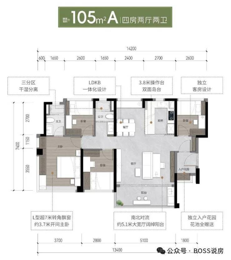 105㎡户型:南北对流大方厅,客厅面积可扩至23㎡,三代同堂无忧