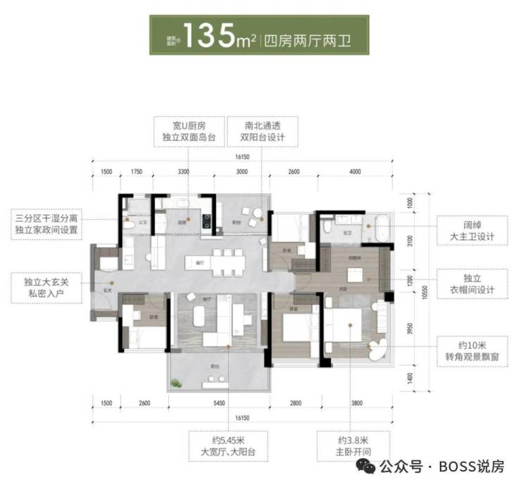 135㎡户型:南北对流双阳台,三代同堂无忧