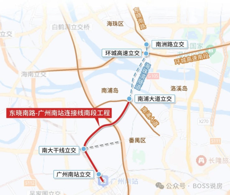 东晓南路 - 广州南站连接线南段将在 2025 年与海珠湾隧道同时建成通车,实现南站和海珠城区约 15 分钟互通,30 分钟连通珠江新城 CBD。