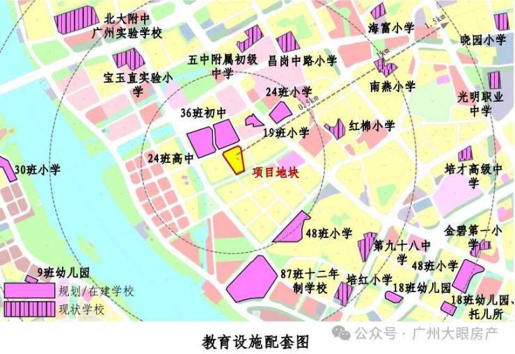 项目自身没有配建学校,但周边名校环伺,3km直线范围内包含广州市五中附属初级中学(省级)、广州市第41中学(省级)、宝玉直实验小学(光大校区)、江南外国语学校、工业大道中小学、红棉小学、海富小学、南燕小学、培红小学等9所学校环伺,拥有完善的区域教育体系。
