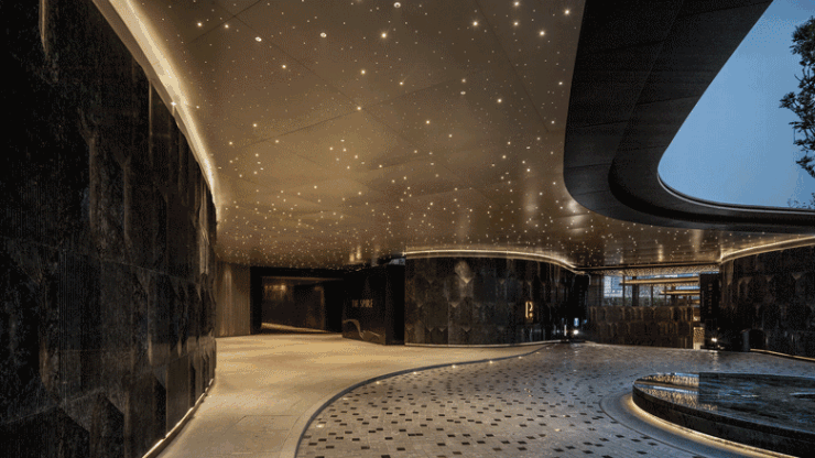 真正的震撼,在于项目以“入住即成林”在CBD极核勾勒出「隐秘的繁盛」。主入口约67米奢阔景墙如折页般展开,园心那棵广州最大最高的麻楝树王傲然挺立。不仅如此,一期的园区更至少以数十种奢石,让日常行走都变成一场美学巡礼。像入口处马达加斯加蓝翡翠奢石雕琢“玉璧水景”、门厅地面铺开安缦酒店同款安哥拉灰,与巴西铂金钻大理石交织……
