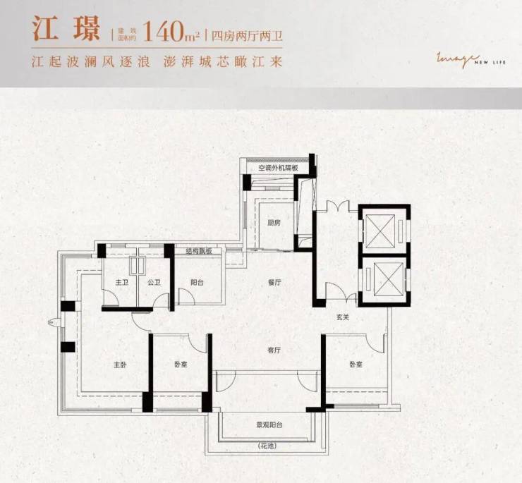 建面约140㎡户型:尊贵大四房设计,位于板楼中,享有专梯专户体验。一线望江,尽享尊贵与舒适。