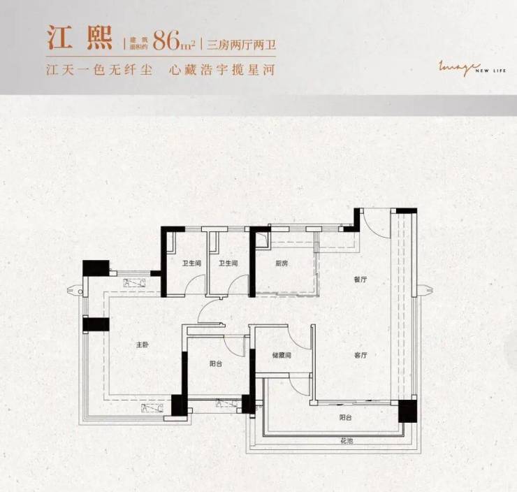 建面约86㎡户型:精致三房设计,配备南向观景阳台,确保室内光线充足。全屋动静分离,主卧配备270°飘窗,拓展视野。