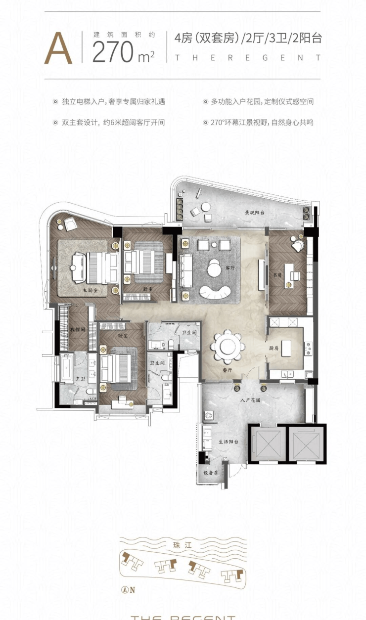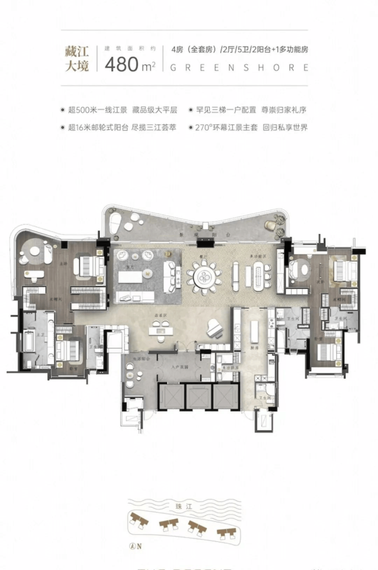 项目总占地800亩(约53万㎡),仅为千户所有,容积率约1的低密奢阔墅区。拥有三江汇聚的甄稀景观,是全城难得享受双向江景的豪宅,饱览城市中央独特的江畔景致。