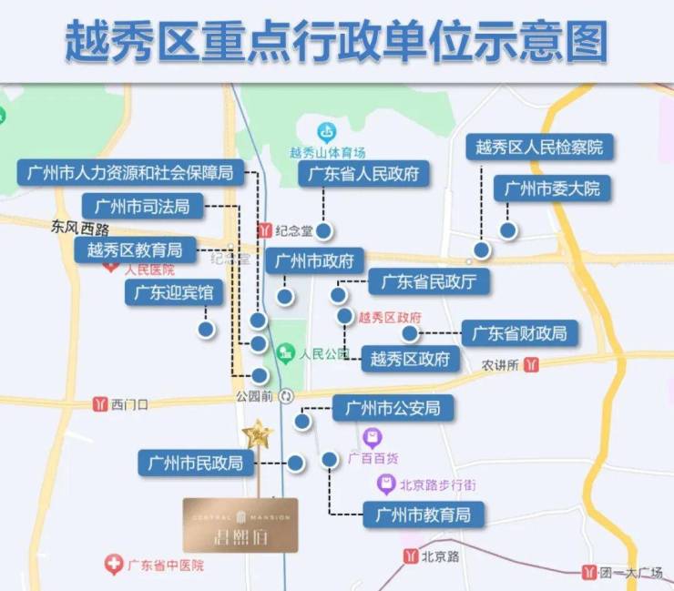 项目坐落于承载南越国文明、近代革命风云及现代省市行政中心的千年中轴上,是广州文化根脉与政务中枢所在。1公里范围内省级、市级机关单位高度集中,形成独特的高浓度政务文化氛围与稀缺的高端圈层。