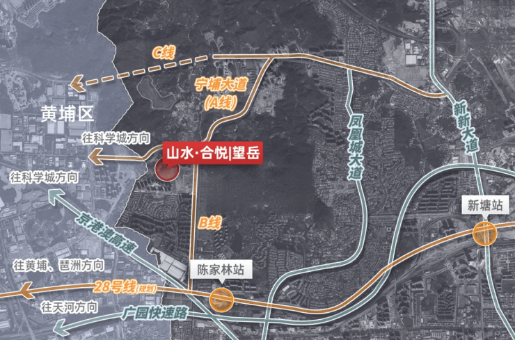 如果选择地铁出行,有规划中的28号线的陈家林路站,距离项目大概只有900米左右,目前规划站点在合生湖山国际那边,但还是存在一定的不确定性,地铁建好开通以后,坐地铁去天河、海珠、黄埔等区也非常方便。