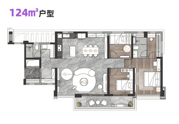 124平虽然是整个项目最小的产品,但同样享有私梯入户设计,入门处除了玄关外还有两边储物空间,全南向四开间加上约7米大阳台,景观与通风的极致体验。