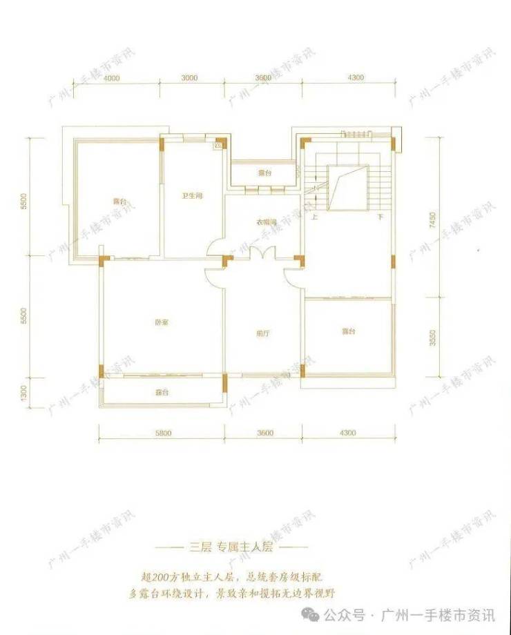 别墅三层则是专属的主人空间,三层整层使用面积超200㎡,整层仅做了一个主人套房,还拥有4个超大露台可一览小区园林湖景。