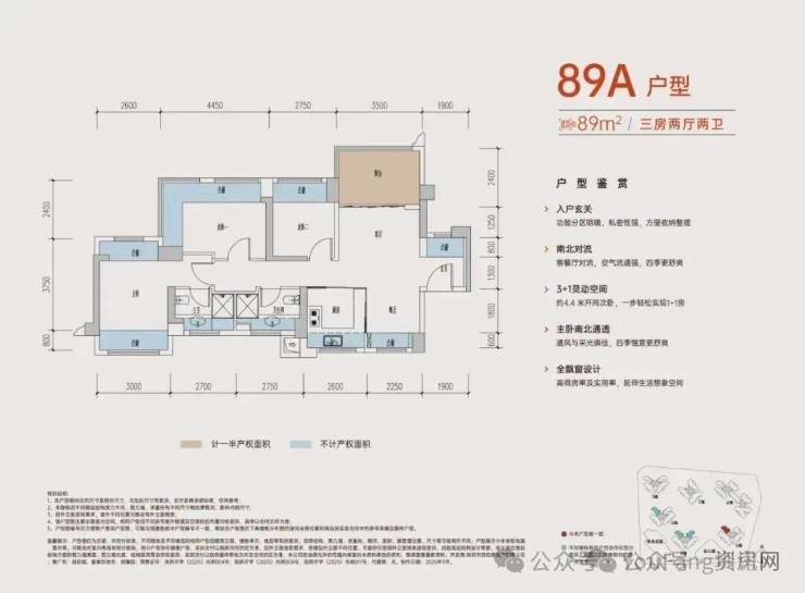 入户处比较宽敞,可以做鞋柜收纳,客餐厅南北对流,全飘窗设计,高得房率及使用率,主卧南北通透,通风和采光不错,套房设计,其中一个次卧可以改成1+1房。