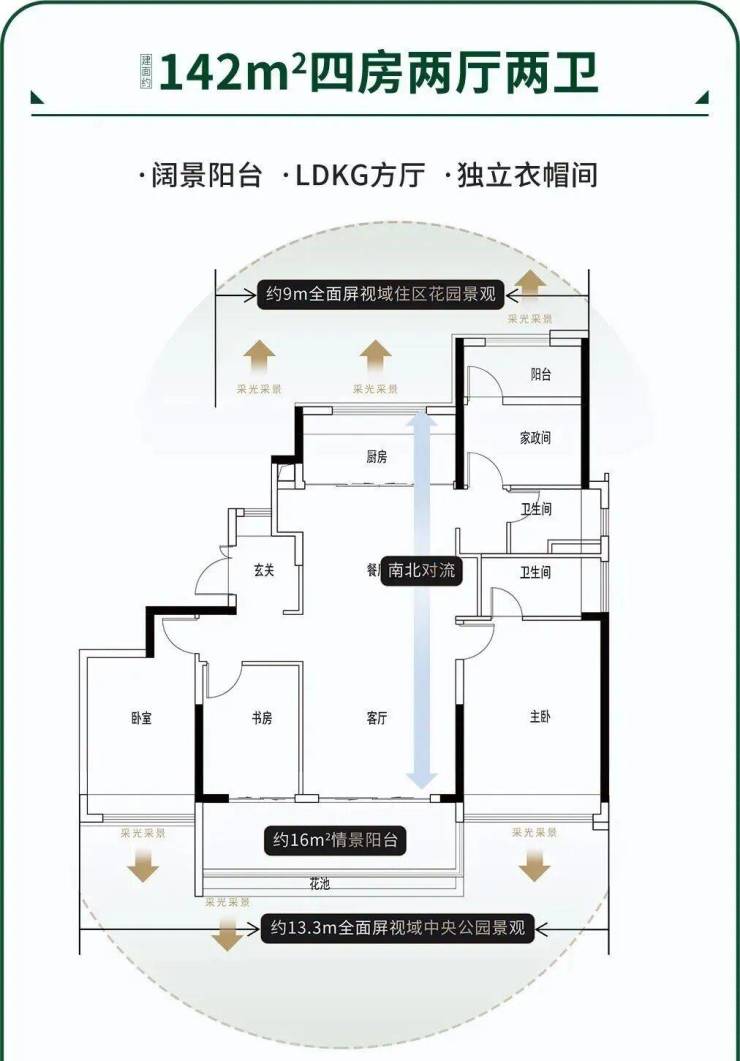 建面175平四房三卫,全屋拥有29米的一线公园景观面,LDKG大通厅,面积约64平,270度全面边厅设计,公园景观面达到29米