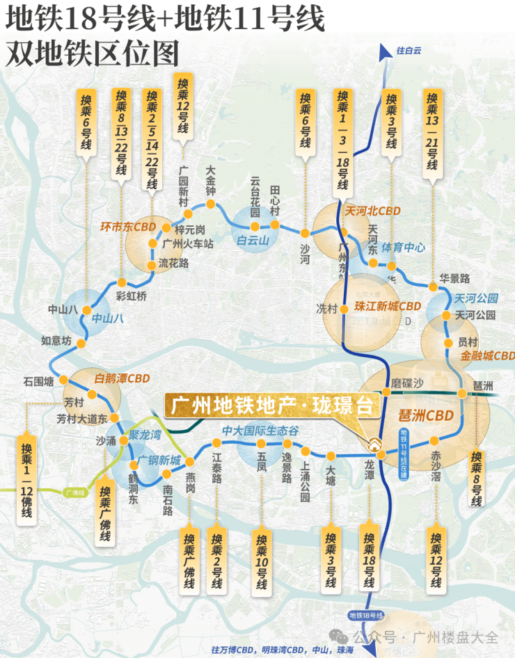 1、交通:广州地铁珑璟台拥有双地铁上盖的独特优势,通过高速地铁18号线和广州首条大环线11号线(已运营)龙潭站,居民可以快速到达珠江新城、琶洲、白鹅潭等地标性商圈。项目采用了TOD社区设计,实现了“地铁入户”,并且设有连廊直通湿地公园,为居民提供了一个高效便捷的生活体系。
