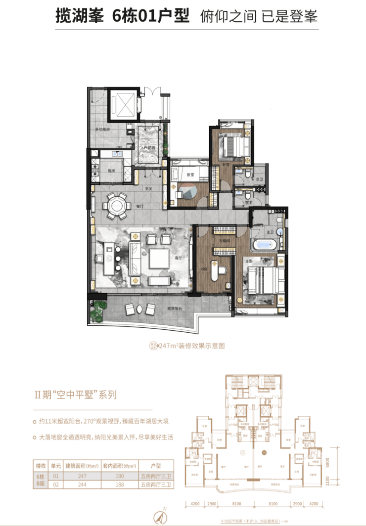 揽湖峯 6 栋 247㎡ 南向湖景天际平墅大平层:此户型为南向设计,可尽享一线湖景,拥有天际般的开阔视野。大平层布局,空间宽敞大气,居住舒适度高,能满足家庭对高品质生活的追求。、