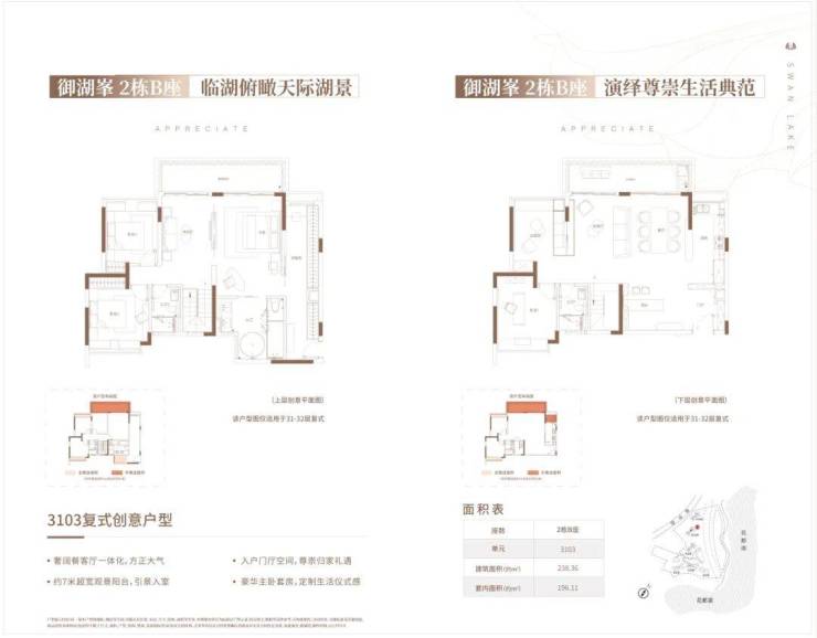 御湖峯 2 栋 B 座 3103 复式户型 238㎡ 创意双钥匙多功能轻奢顶复:独特的双钥匙设计,增加了空间的灵活性和实用性。多功能布局,可满足不同家庭成员的需求,轻奢风格彰显品质与格调,是追求个性与品质生活的理想之选。
