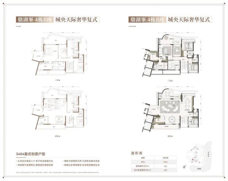 鼎湖峯 4 栋 A 座 3404 户型 266㎡ 轻奢创意顶复·270°城市天际线:266㎡的轻奢创意顶复,拥有 270°城市天际线视野,将城市繁华与自然美景尽收眼底。首层和二层的创意设计,注重空间的合理利用和居住的舒适度,营造出温馨而奢华的居住氛围。