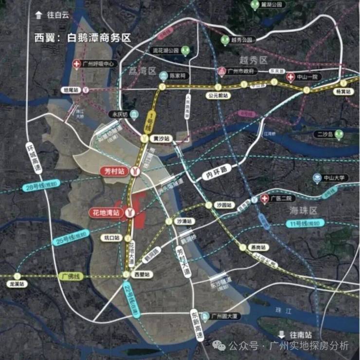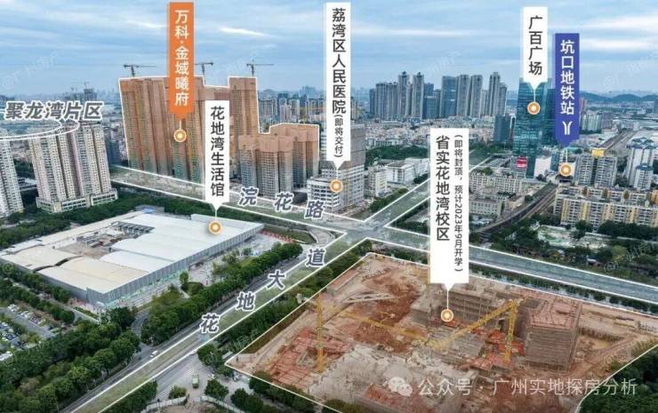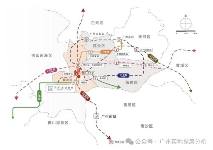 地铁:距地铁1号线花地湾站约500-600米,步行可达;将接入地铁11号线、22号线(已开通)、28号线(规划中),可快速通达天河、越秀、海珠等核心区域。