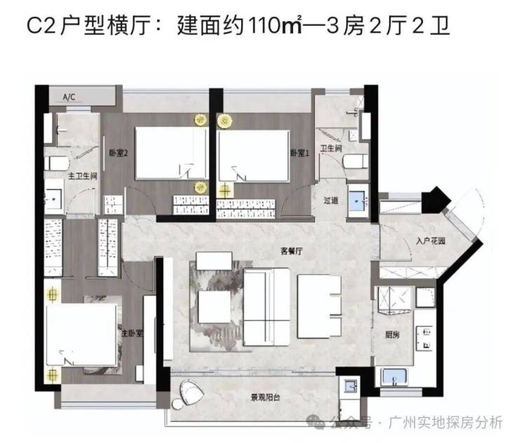 【C2户型】:南朝向,3室2厅2卫,建筑面积110㎡,分布于楼栋3号楼、1号楼。