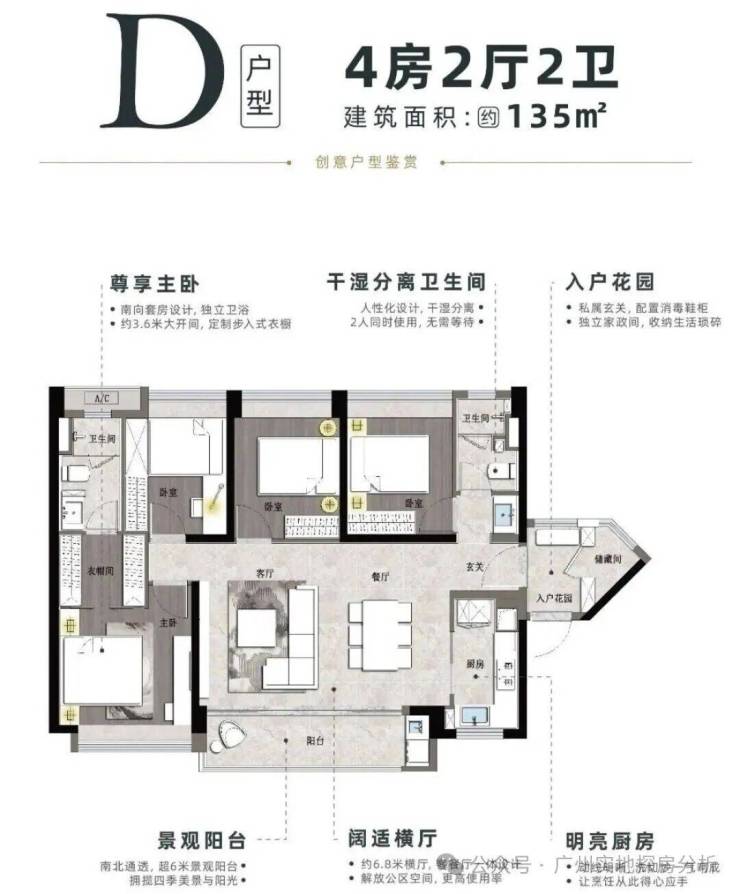 【D户型】:南朝向,4室2厅2卫,建筑面积132㎡,分布于楼栋5号楼、6栋、1号楼。
