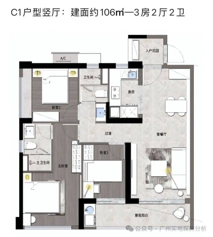 【C1户型】:南朝向,3室2厅2卫,建筑面积106㎡,分布于楼栋3号楼、1号楼。