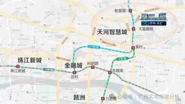 项目距离地铁21号线大观南路站约1.5公里,一站换乘4号线去往金融城、琶洲,4站到员村换乘5号线直抵珠江新城。