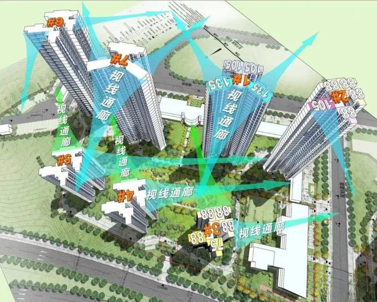 其一,散点式排布,每栋楼都是独立的,楼栋左右有三四十米的间隔,最大化提高了楼栋两侧单边位的采光面和视距。