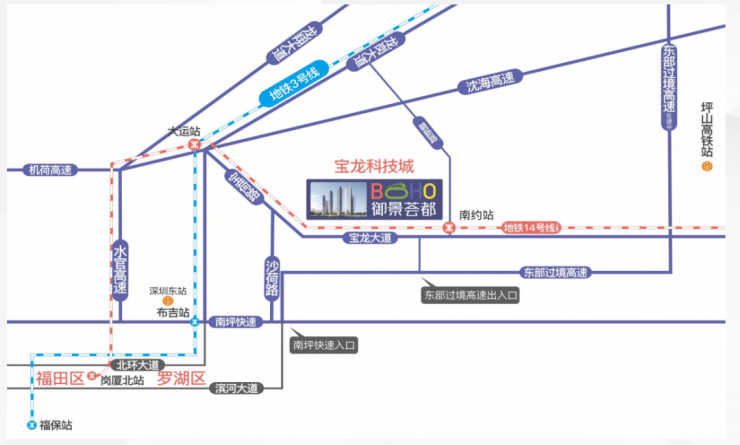 项目直连地铁 14 号线 南约地铁口(规划中 31 号23 号线),2 站大运、9 站福田中心,未来可享四地铁交汇利好;沈海高速和东部过境高速南北贯穿直通罗湖,无缝连接福田、南山;坐享地铁、铁路交通、公交枢纽等多维交通体系,快速通达深圳中心城区、香港及周边城市,高效链接都会生活圈。