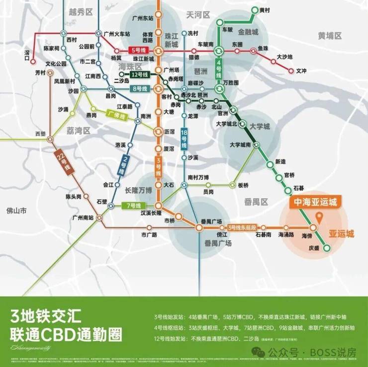 地铁交通:天际组团距离地铁 3 号线和 4 号线的海傍站 E 出口约 1.2 公里,步行需 19 分钟左右。从海傍站出发,乘坐 3 号线 4 个站到番禺广场,6 个站到长隆万博,13 个站到珠江新城;乘坐 4 号线 6 站可到琶洲,7 站到天河。此外,规划中的 8 号线东延段正在建设中,未来将进一步提升区域交通便利性。