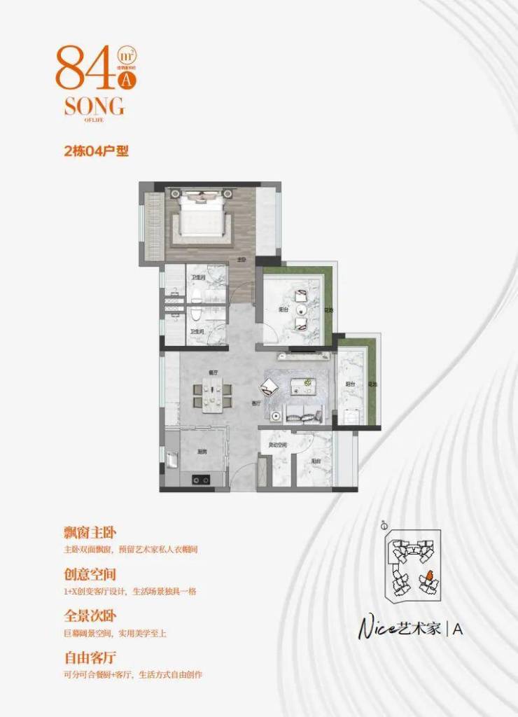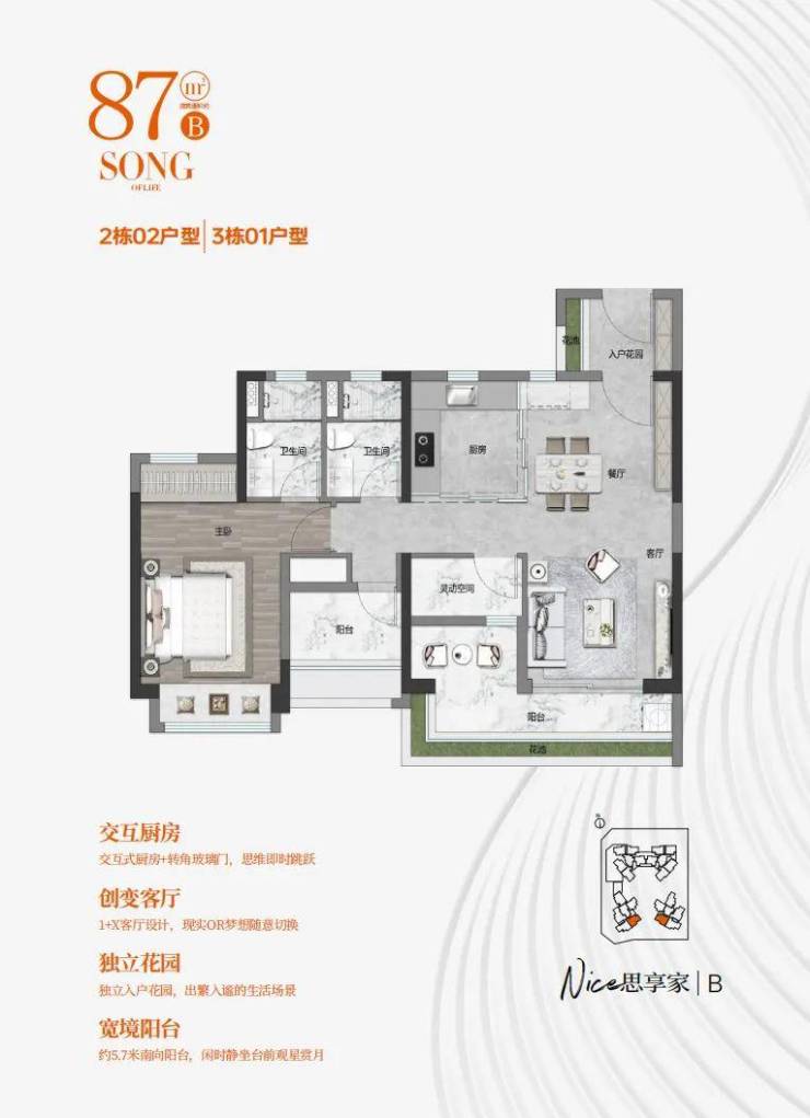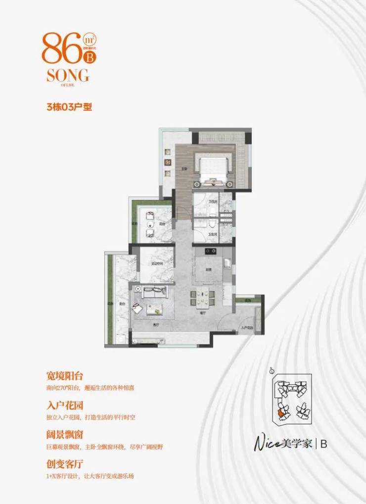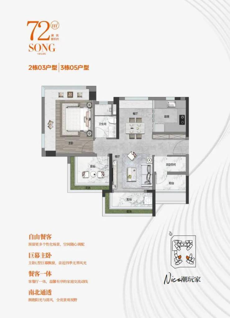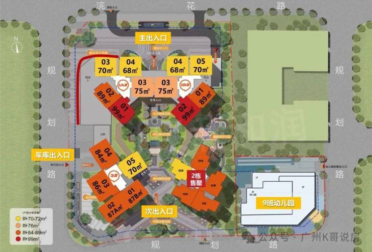 总价低、朝向好、户型靓,是它的卖点,建面71-87平三房,70-100方的三-四房。