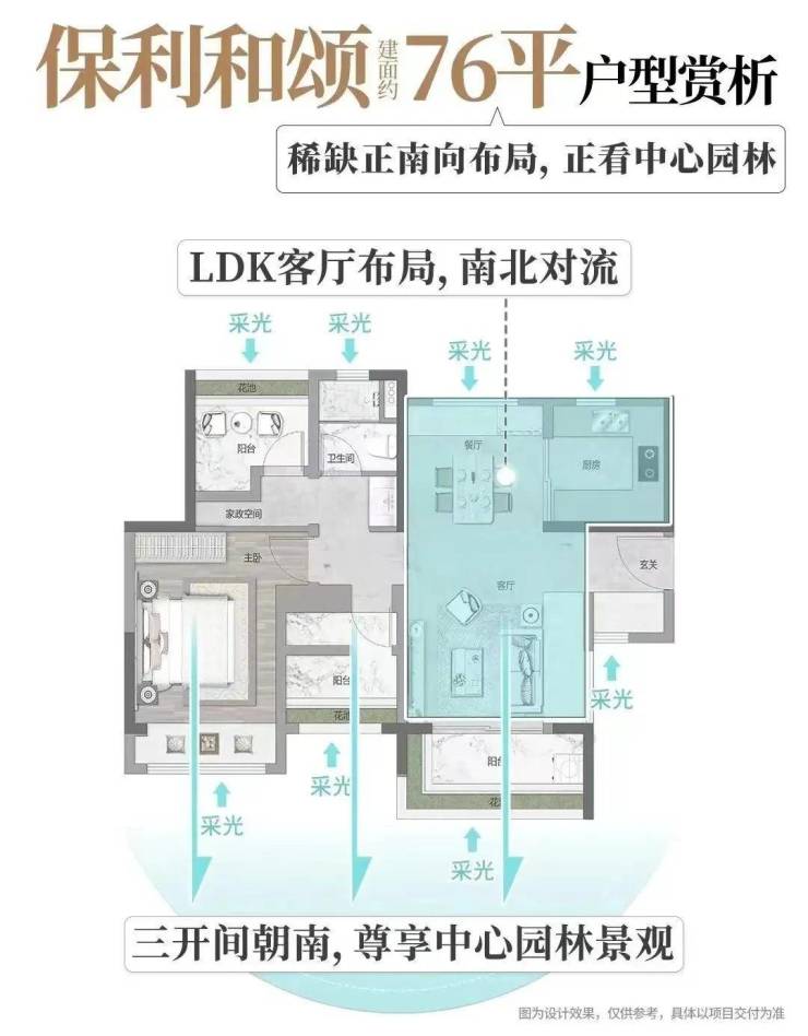 ▪南北对流 ,三开间朝南望中心花园,1+X客厅设计,客厅开间约3.8米