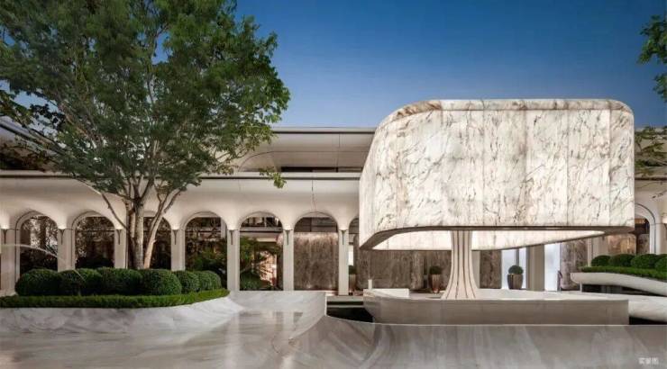 由安哥拉黑奢石打造的静谧水亭,曲水纳福,门庭显贵;照壁两旁,六棵百年红果冬青树阵列两侧,寓意家族昌盛。汇珠水,造归庭,是为归家的第一道礼序。