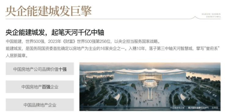 央企中国能源建设集团有限公司,连续10年荣登世界500强;中能建城市投资发展有限公司,国务院国资委首批确定以房地产为主业的16家央企之一,“中国房地产公司品牌价值十强”、“中国房地产百强企业”。3A信用等级;代表案例:能建湾区金融城、广州紫郡府、葛洲坝保利曼城、保利葛洲坝海德公馆。
