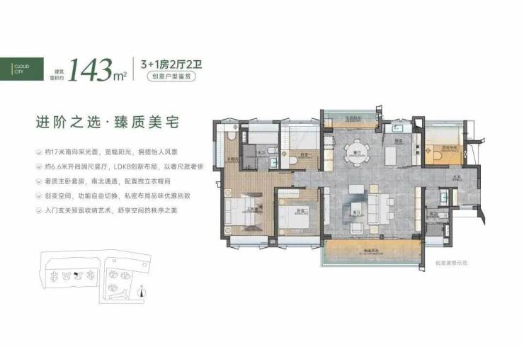 户型面积:建面约72-105㎡3+1房、110-143㎡阔境臻品
