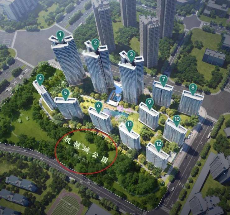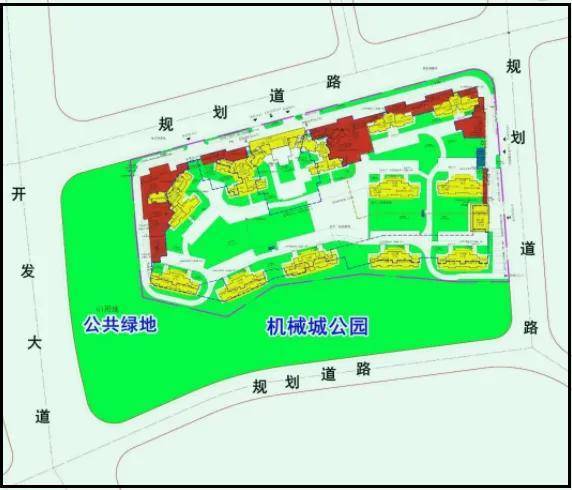 项目南侧和西侧规划了与小区体量相当的公园绿地(机械城公园)。其中,西侧临开发大道绿地带宽约80米,南侧机械城公园300米*100米。由此形成一道绿色屏障,对于前排小高层板楼,可以有效降噪降尘,也拉开楼距,提升了视野景观质量。