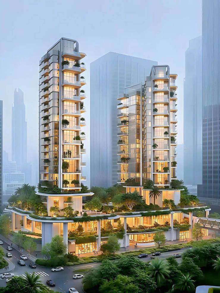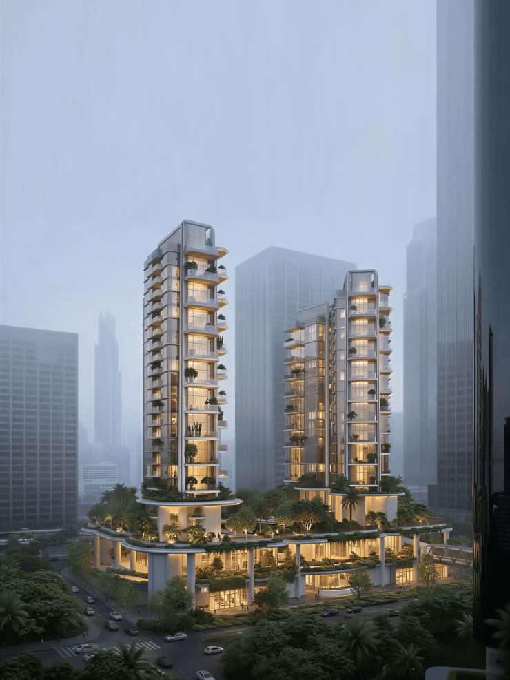 • 空中花园:抬升层之上,打造完整且静谧的中央社区花园,形成“空中绿岛”景观。采用“竖向抬升、水平分区、三重生态”策略,搭配垂直绿化系统,构建可自我调节的“垂直生态舱”,既能隔绝城市喧嚣,又能实现景观层次与生态效能的双重突破,推窗即见绿意盎然。