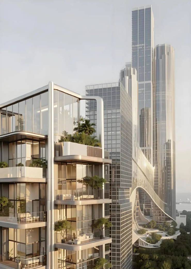 ▪️ 巨柱骨架:建筑以灰色超级巨柱为竖向支撑,线条挺拔有力,形成强烈的垂直向上感与空间延展感,既彰显出蓬勃的生命力,又自带未来科技感,与深超总的摩天气质完美契合。