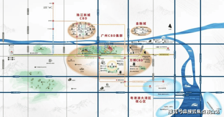 香江 1 号位于番禺大道北与朝阳东路交汇处,属于番禺大石板块,直线距离珠江新城约 10 公里,开车走新光快速,非高峰期 25 分钟左右能到天河。对于在天河、海珠上班的人来说,这个位置算比较折中,比住南沙、增城通勤时间更可控。周边有长隆旅游度假区、万博商务区等,生活配套和就业机会都比较丰富。