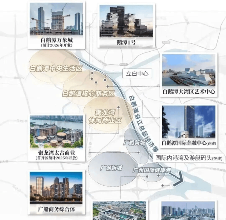 作为西翼CBD,则以重奢为支点、以沿江带为依托,开辟了一条带状连片、向外辐射的发展路径。白鹅潭不但产业猛进,各个维度的兑现相当“勤奋”。从搞商业、促旧改到建枢纽与修路桥,整个板块总让人常看常新。